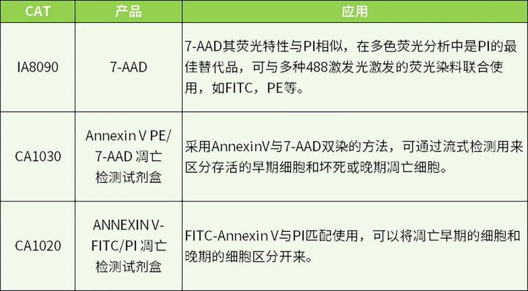 Annexin V具有易于結(jié)合到磷脂類如PS的特性,對(duì)PS有高度的親和性。因此,該蛋白可充當(dāng)一敏感的探針檢測(cè)暴露在細(xì)胞膜表面的PS。7-AAD是一種非滲透性的核酸熒光染料,該染料不能透過(guò)活細(xì)胞的細(xì)胞膜,但可穿透膜損傷細(xì)胞如晚期凋亡細(xì)胞或者壞死細(xì)胞的細(xì)胞膜并與其內(nèi)的DNA結(jié)合,可用來(lái)區(qū)分存活的早期細(xì)胞和壞死或晚期凋亡細(xì)胞。因此,可以采用AnnexinV與7-AAD雙染的方法,通過(guò)流式檢測(cè)細(xì)胞早期凋亡。