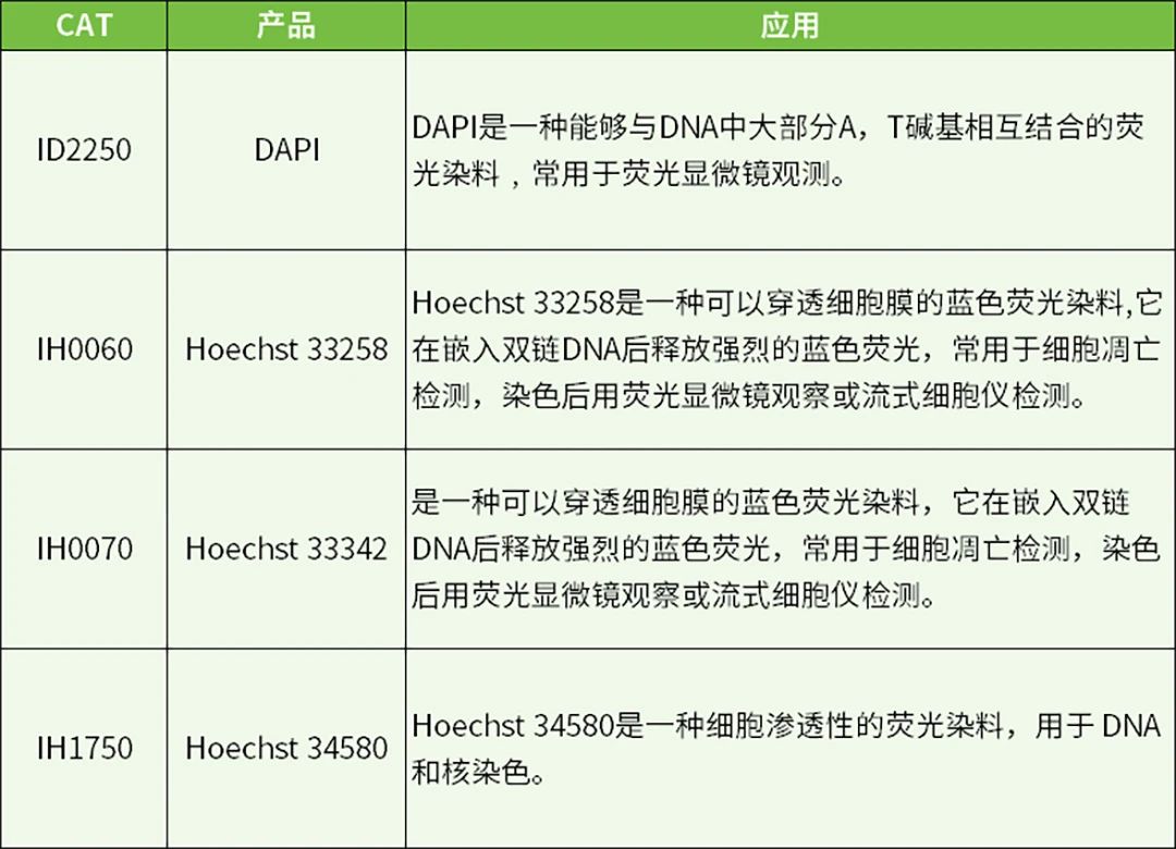 細(xì)胞發(fā)生凋亡時(shí),細(xì)胞膜通透性會(huì)逐漸降低。Hoechst系列可以穿透細(xì)胞膜,染色后凋亡細(xì)胞熒光會(huì)比正常細(xì)胞明顯增強(qiáng)。膜不可滲透性染料(例如:Propidium Iodide/PI)不能穿透細(xì)胞膜,對(duì)于具有完整細(xì)胞膜的正常細(xì)胞不能染色。而對(duì)于壞死細(xì)胞,其細(xì)胞膜的完整性喪失,膜不可滲透性染料染料可以染色壞死細(xì)胞。根據(jù)此特性,使用Hoechst系列和PI染料雙染后,使用流式細(xì)胞儀或熒光顯微鏡檢測(cè)時(shí),正常細(xì)胞為弱紅色熒光+弱藍(lán)色熒光,凋亡細(xì)胞為弱紅色熒光+強(qiáng)藍(lán)色熒光,壞死細(xì)胞為強(qiáng)紅色熒光+強(qiáng)藍(lán)色熒光。